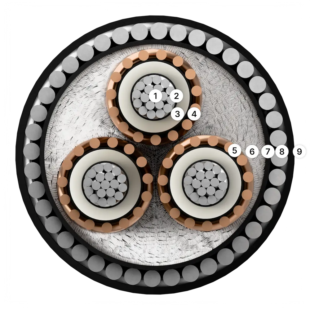 A high-performance power cable with stranded copper or aluminium conductor, XLPE insulation, copper wire screen, non-hygroscopic fillers, galvanised steel round wire armour and PVC outer sheath ensuring durability, safety, and reliable power transmission across demanding applications.